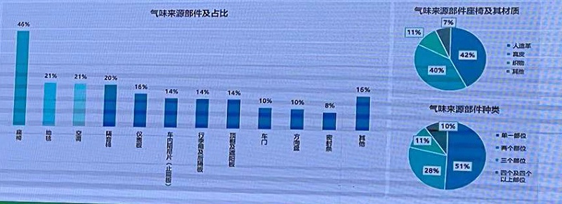 排名前三的車內(nèi)氣味來源部位為座椅、毛氈和空調(diào);從座椅部件來看,其發(fā)出氣味的主要材質(zhì)是人造革材質(zhì)(42%)。從部件數(shù)量來看,有超四風(fēng)之三的用戶認(rèn)為車內(nèi)的異味主要來源車內(nèi)的某一到兩個(gè)部件,說明氣味來源集中度高。