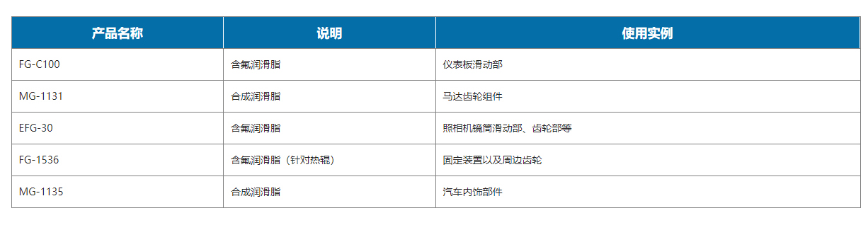 從常規(guī)滑動專用潤滑脂到接點專用潤滑脂、扭矩潤滑脂、導電性潤滑脂、含浸油等,我們提供能滿足客戶多樣性需求的潤滑脂,并且從產品的開發(fā)階段就給客戶提供支持??蓮V泛運用于辦公自動化設備、試聽設備、照相機、汽車零部件等的機構部位。