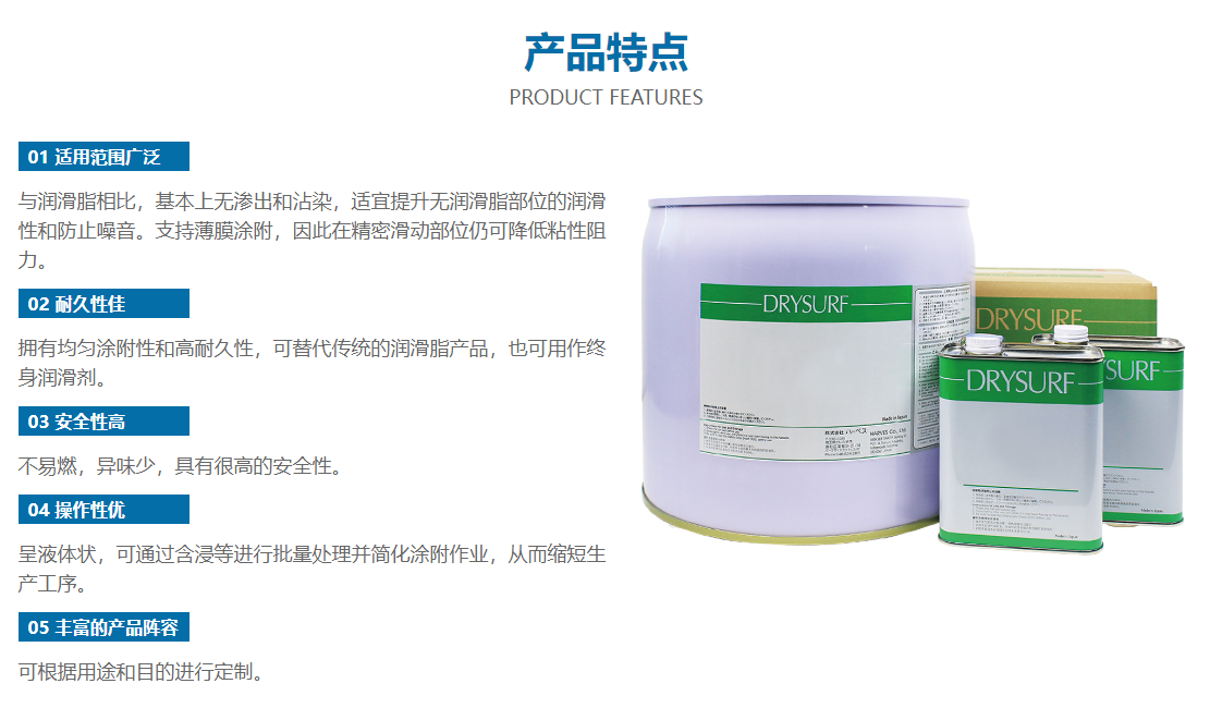 全干型速干型潤(rùn)滑劑完全不含油分,可形成完全干燥的被膜,無(wú)沾染和油性污染(吸塵、滲出等)。